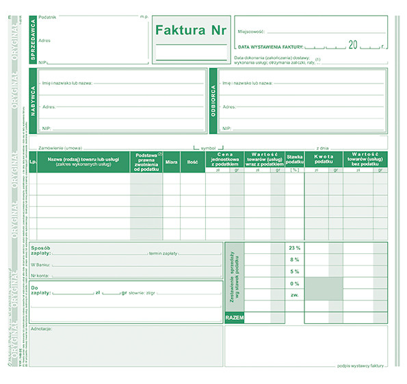 | zastosowanie: | faktury i inne dokumenty wynikające z przepisów o podatku od towarów i usług |