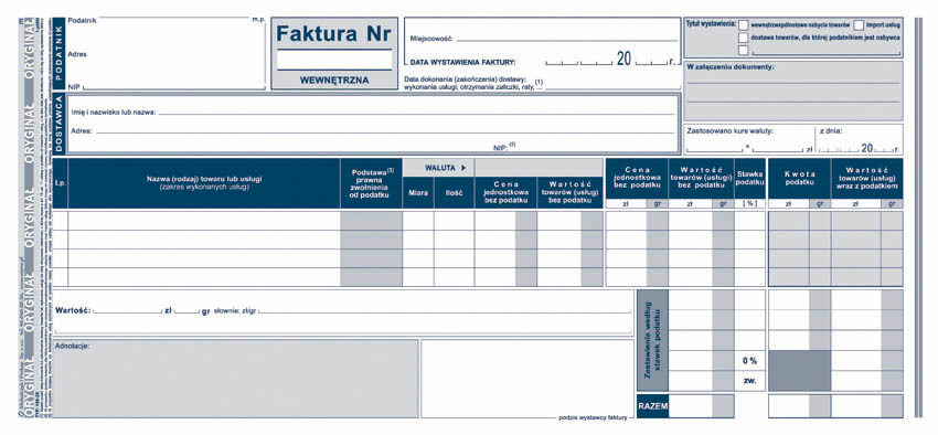 | zastosowanie: | faktury i inne dokumenty wynikające z przepisów o podatku od towarów i usług |