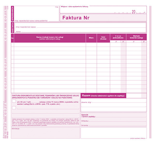 | zastosowanie: | faktury i inne dokumenty wynikające z przepisów o podatku od towarów i usług |