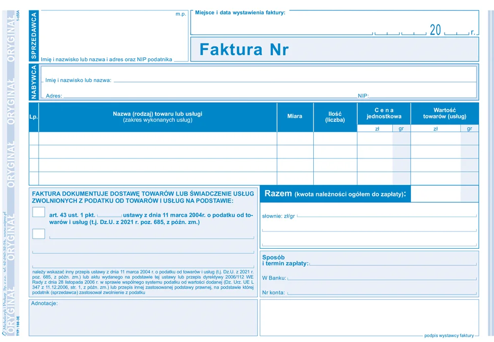 198-3E Faktura. Czynności zwolnione z podatku na podstawie art. 43 ust. 1 pkt. 2-41 ustawy z dnia 11 marca 2004 r. o podatku od towarów i usług