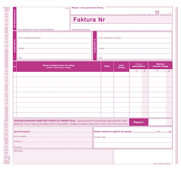 | zastosowanie: | faktury i inne dokumenty wynikające z przepisów o podatku od towarów i usług |