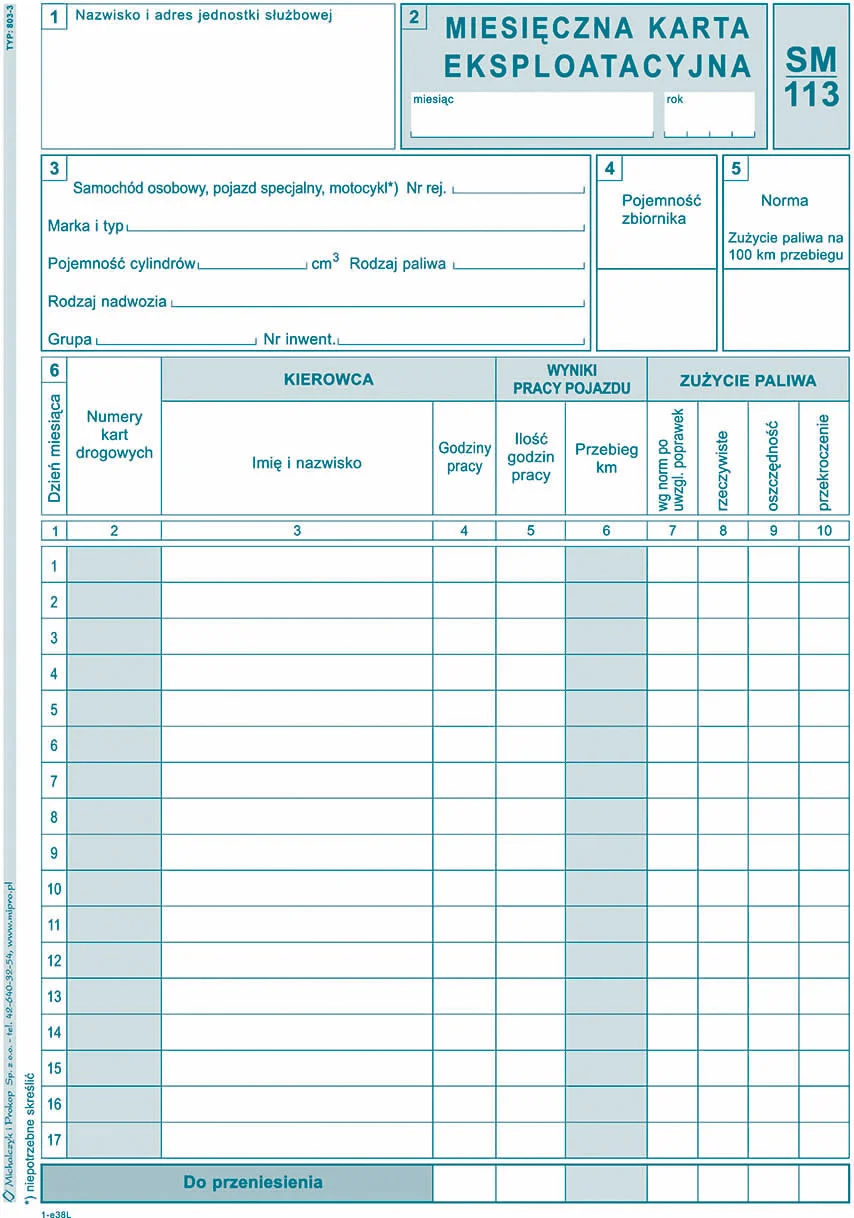 803-3 Miesięczna karta eksploatacyjna sm/113 (samochód osobowy)