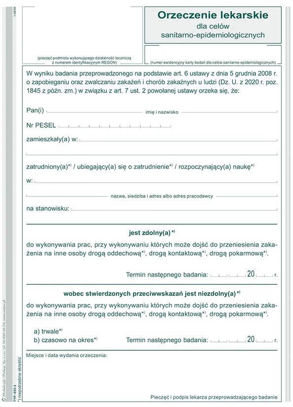 855-3 Orzeczenie lekarskie z badania przeprowadzonego do celów sanitarno-epidemiologicznych
