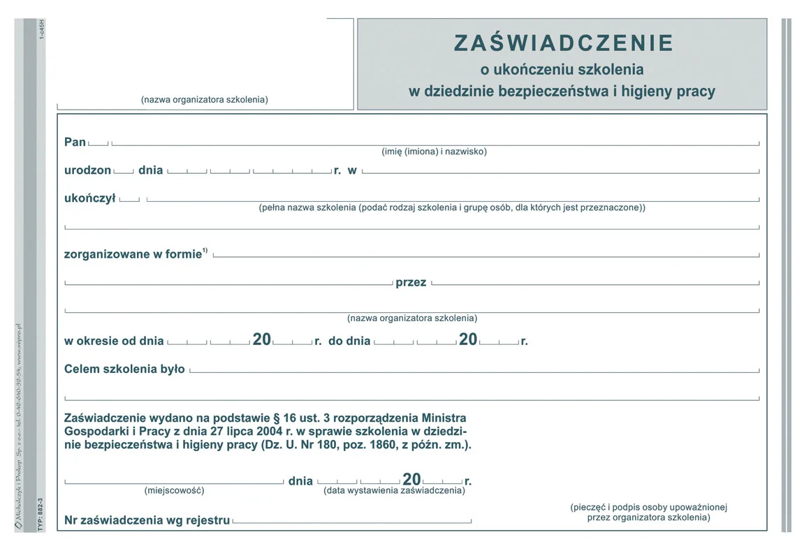 882-3 Zaświadczenie o ukończeniu szkolenia w dziedzinie bezpieczeństwa i higieny pracy