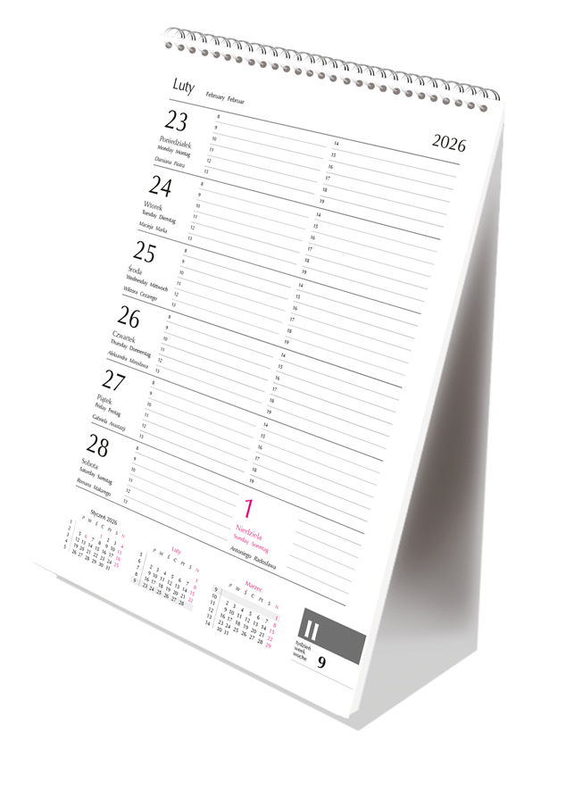 | układ kalendarium: | 1 tydzień - 1 strona |