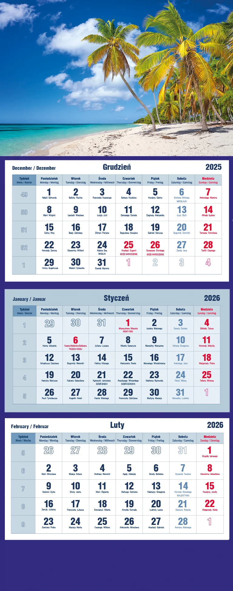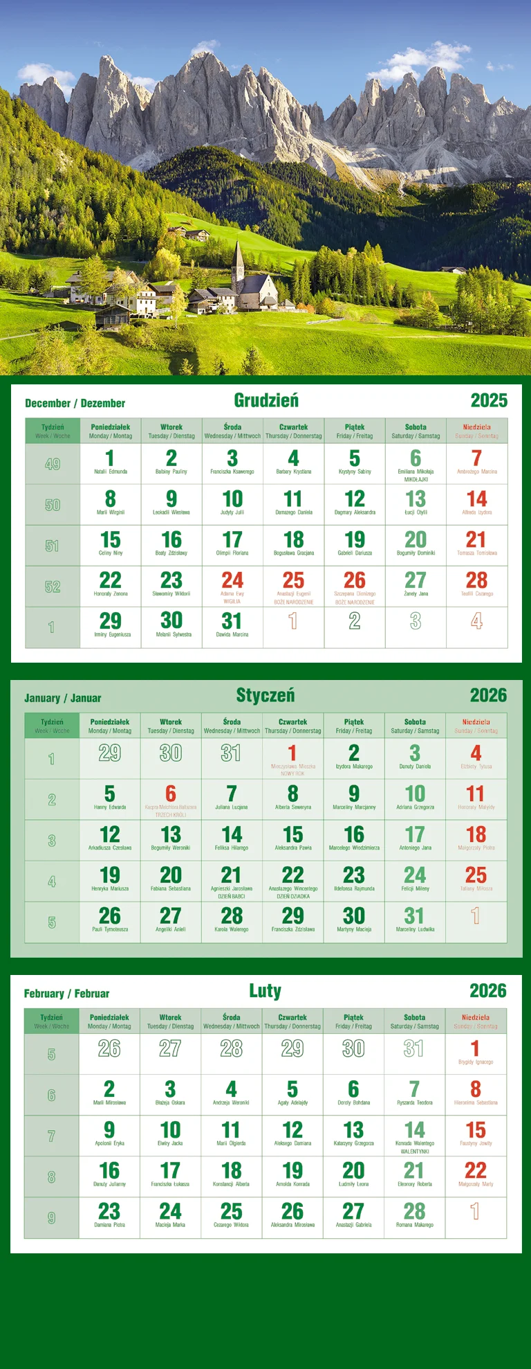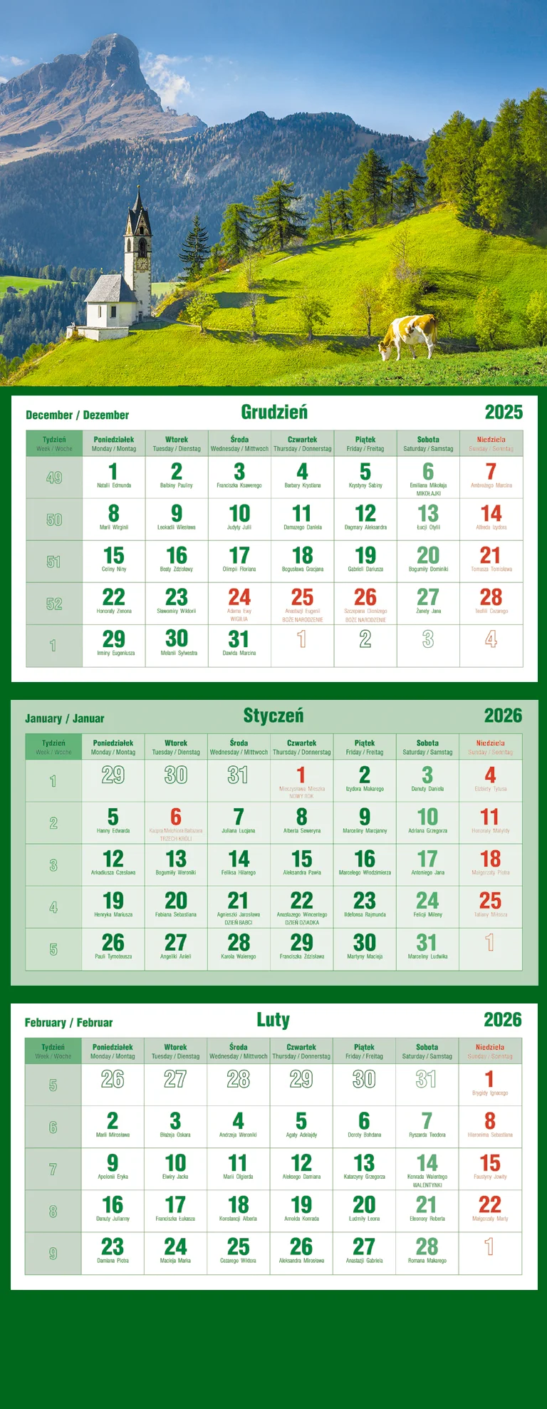 | Główka pełnokolorowa, okienko przesuwane, nazwy miesięcy i tygodni w wersjach językowych, miejsce na nadruk reklamowy. | |