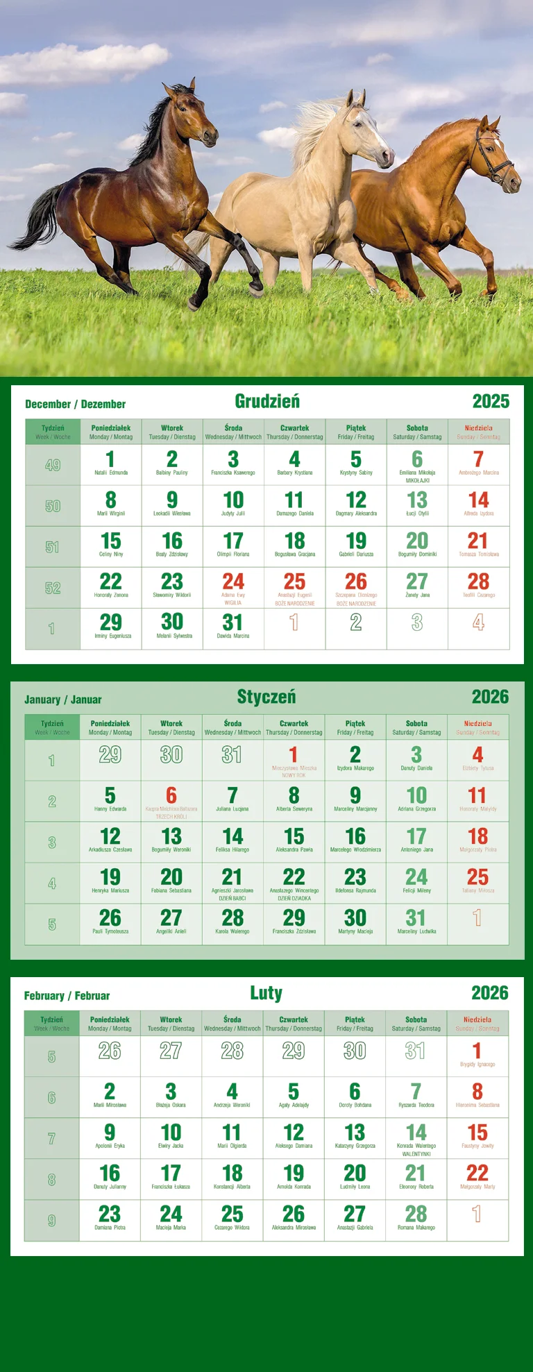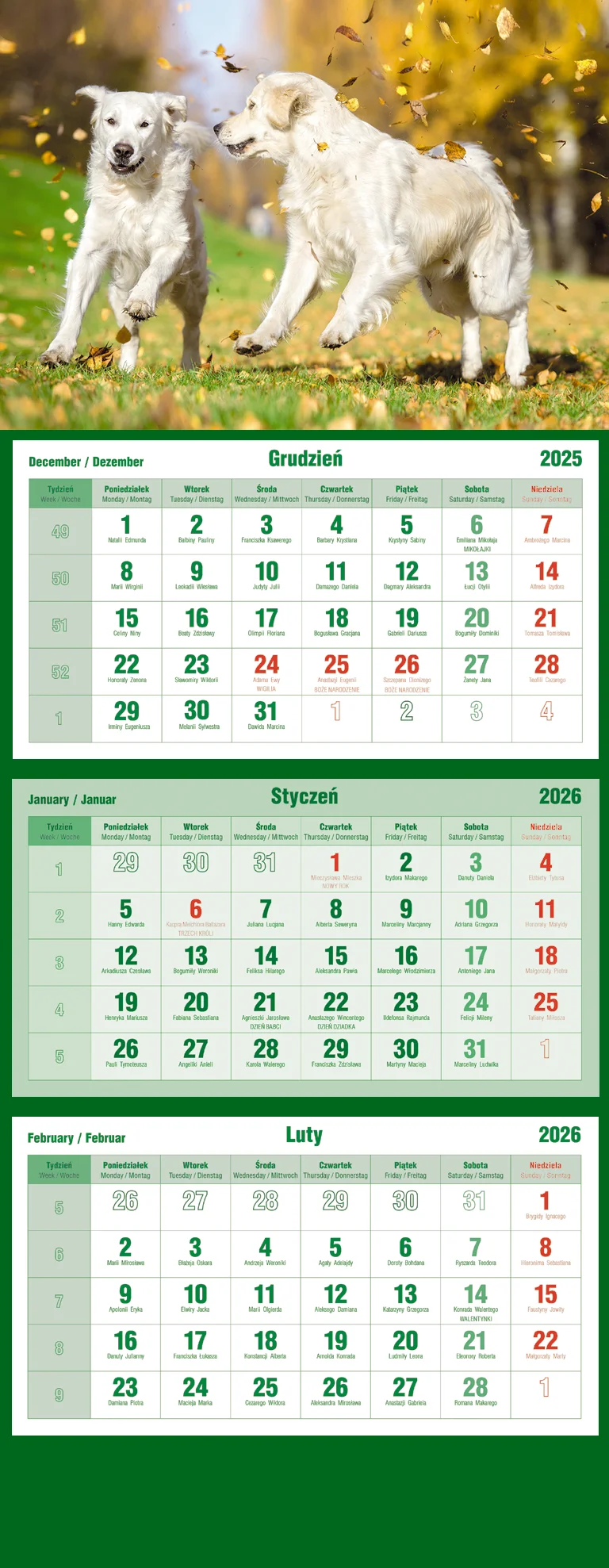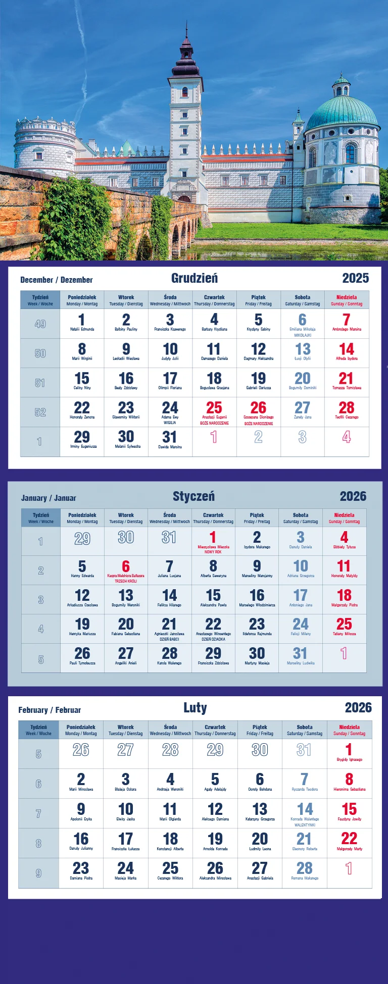 | Główka pełnokolorowa, okienko przesuwane, nazwy miesięcy i tygodni w wersjach językowych, miejsce na nadruk reklamowy. | |