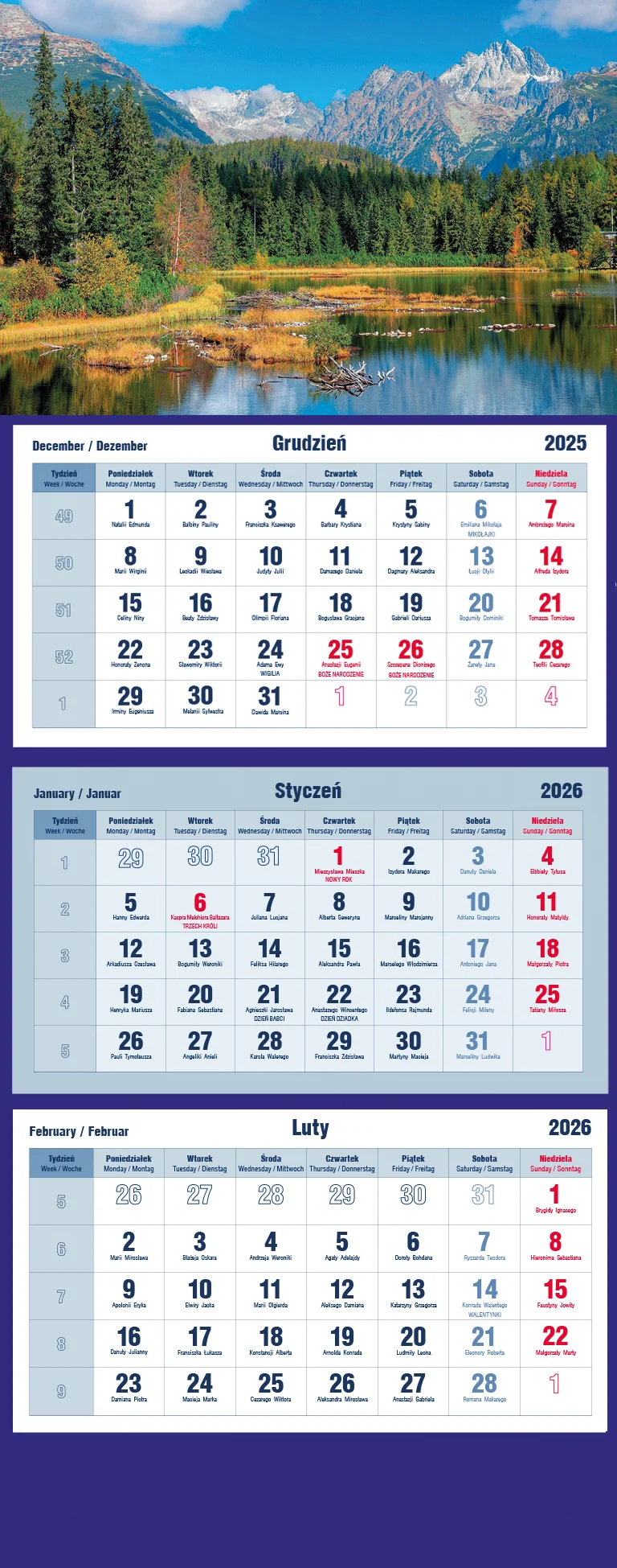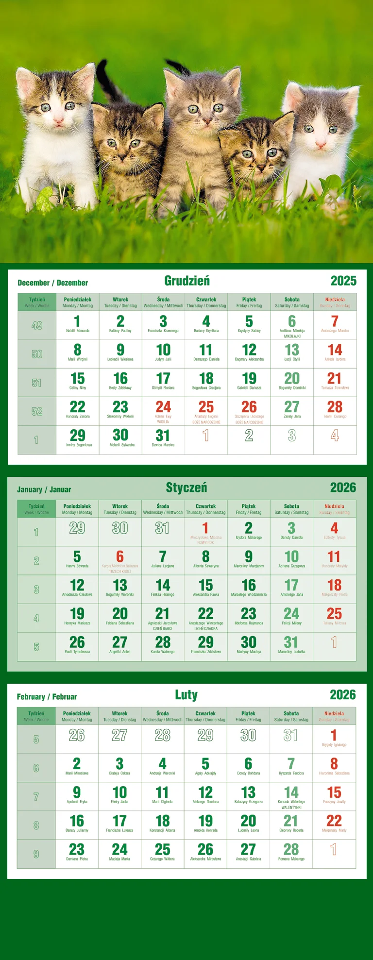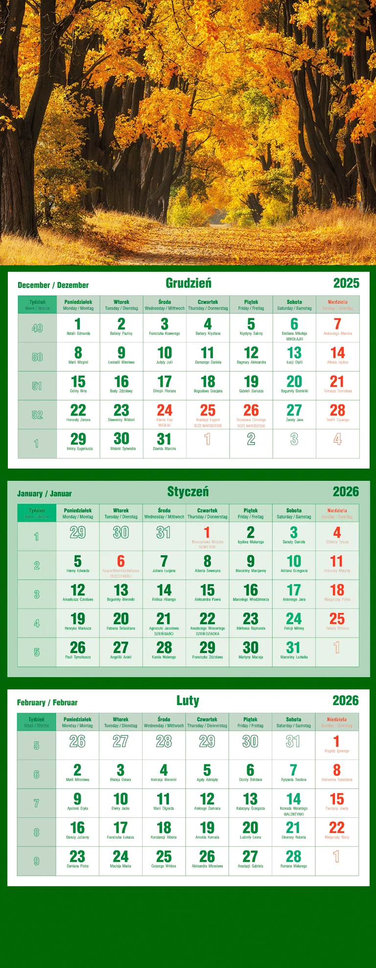 | układ kalendarium: | 1 miesiąc - 1 kartka |