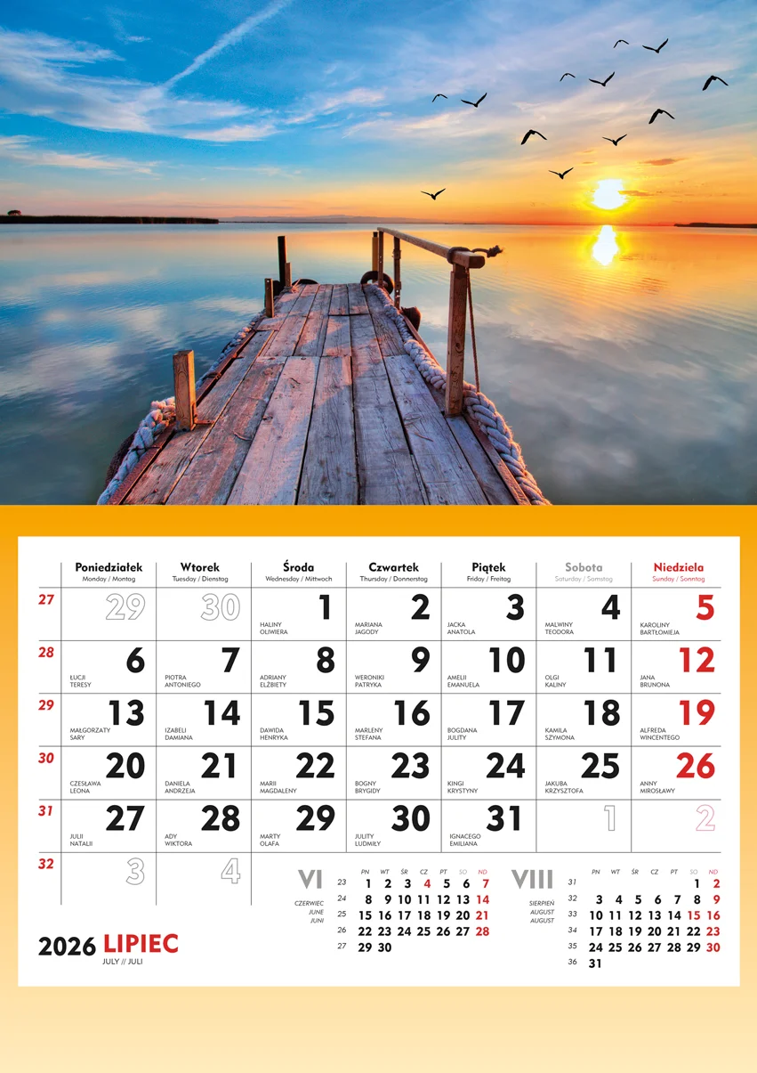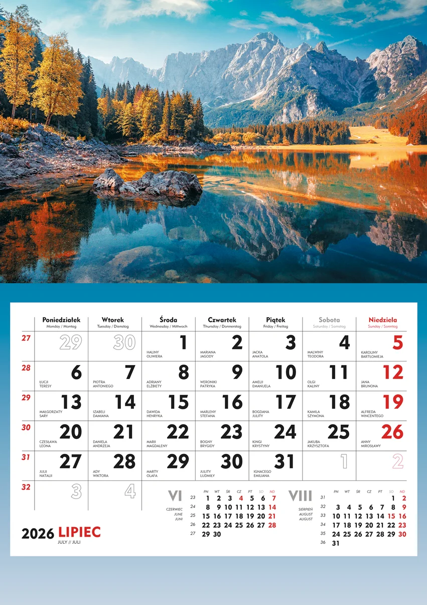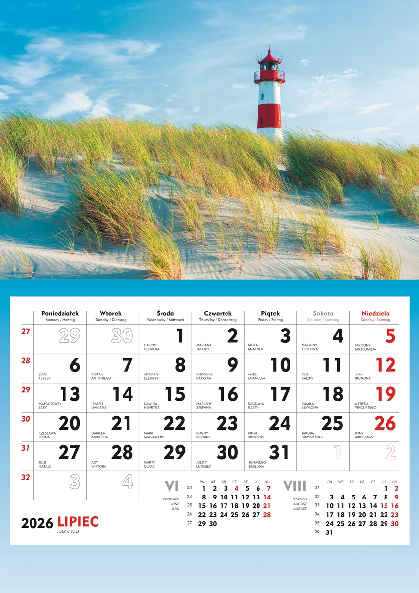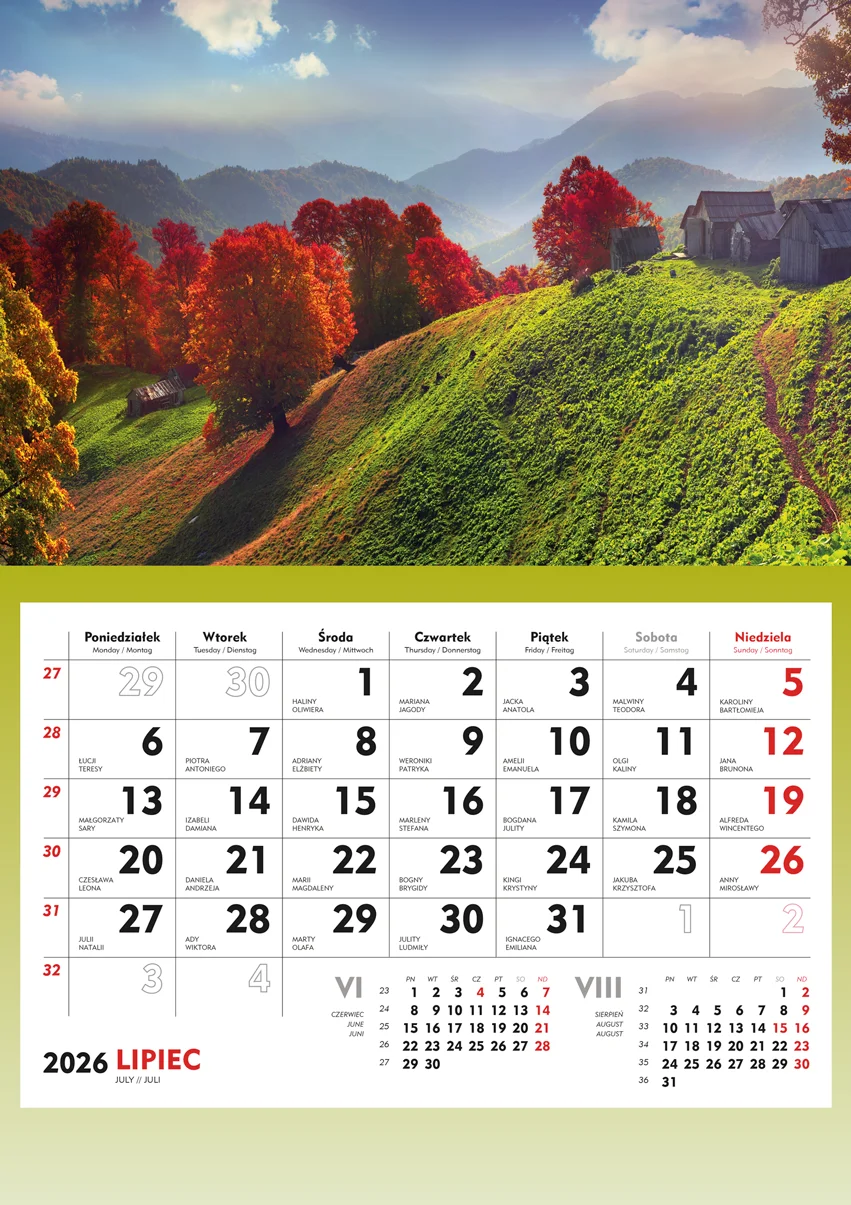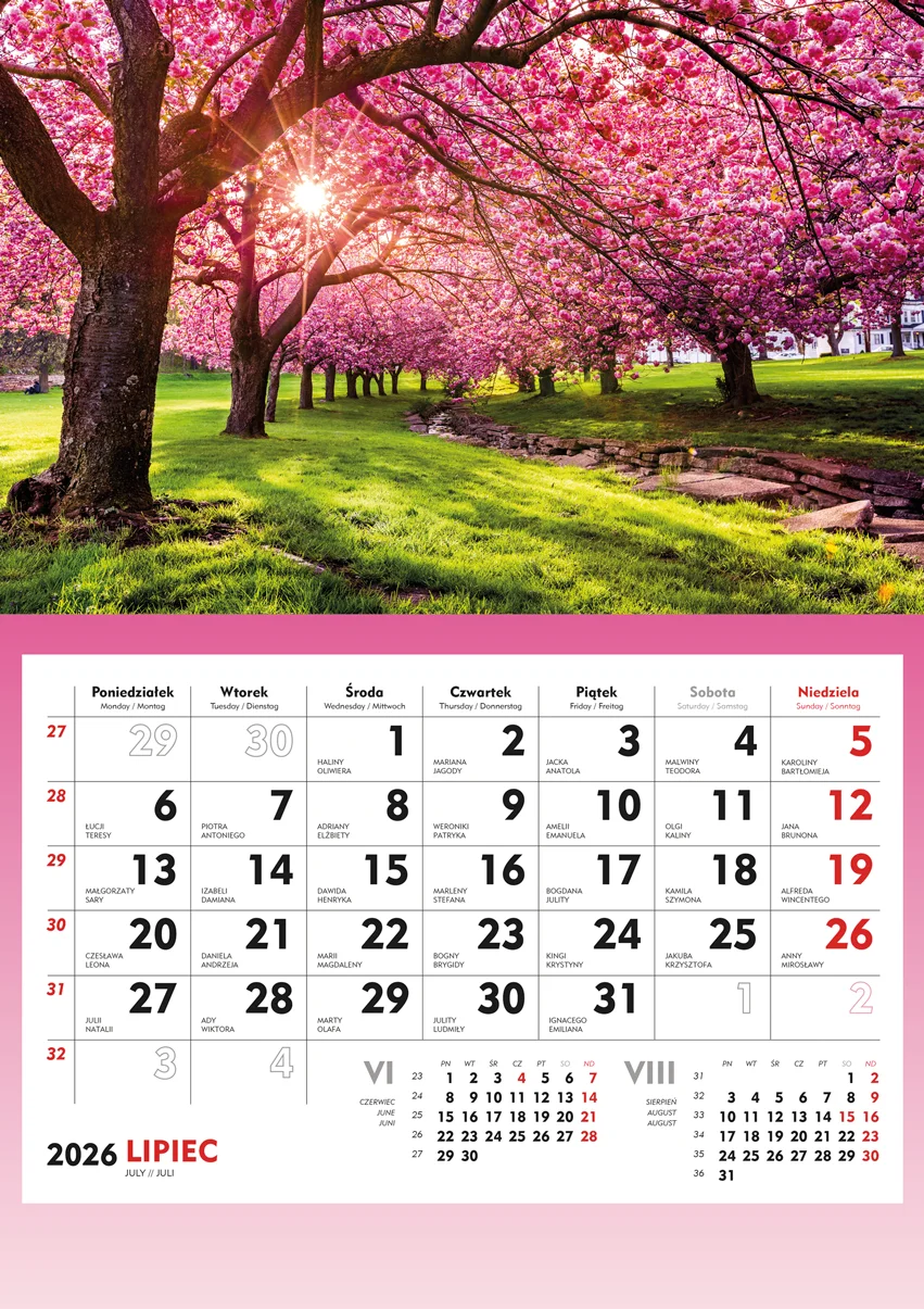 | Główka pełnokolorowa, okienko przesuwane, nazwy miesięcy i tygodni w wersjach językowych, miejsce na nadruk reklamowy. | |