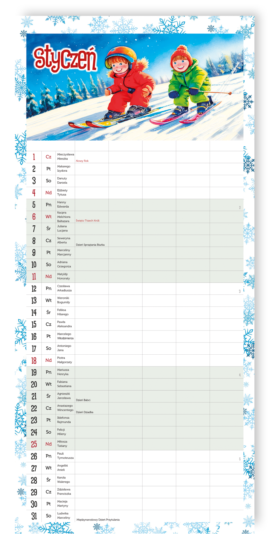 | układ kalendarium: | 1 miesiąc - 1 strona |