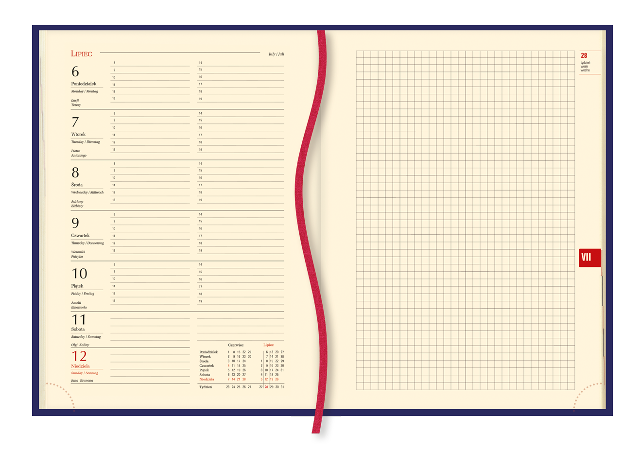 | układ kalendarium: | 1 tydzień - 1 strona + strona na notatki |