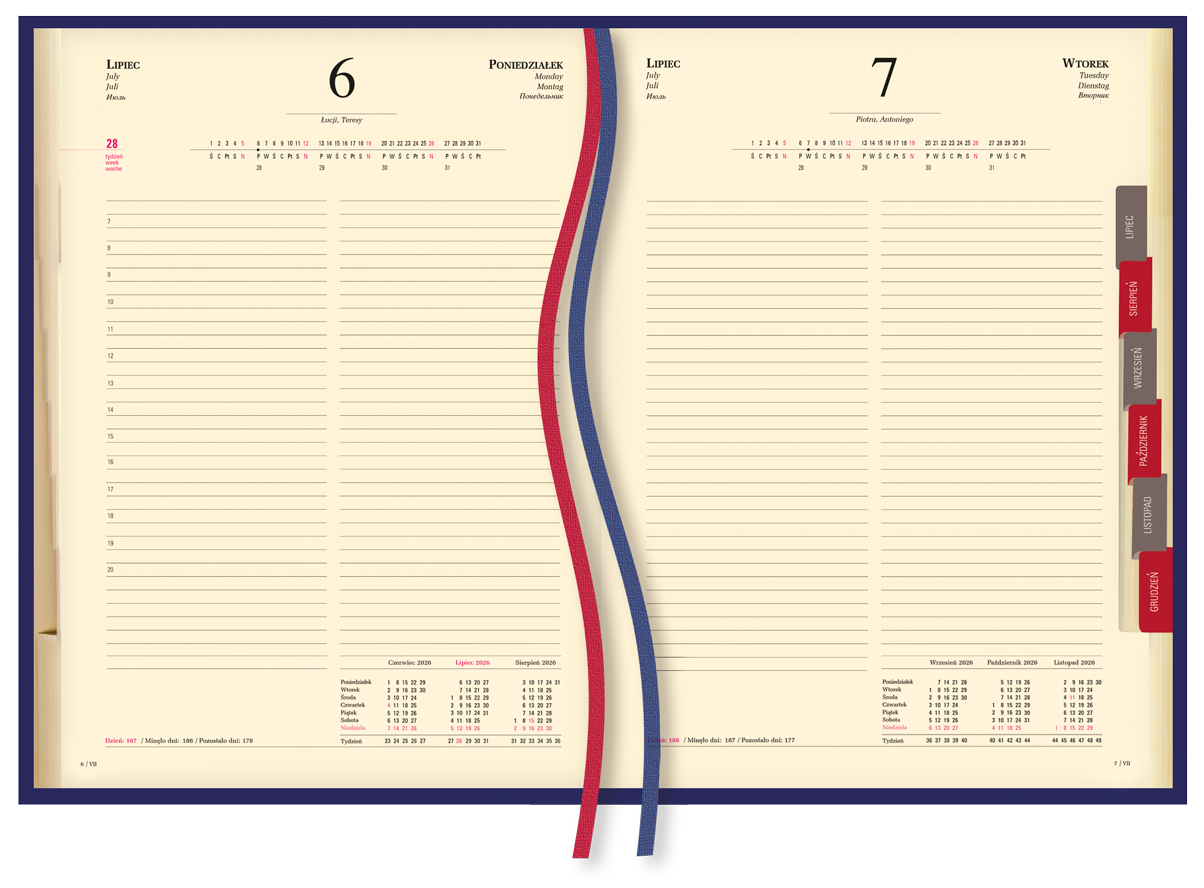 | układ kalendarium: | 1 dzień - 1 strona + strona na notatki po zakończeniu tygodnia. Sobota i niedziela na oddzielnych stronach. |