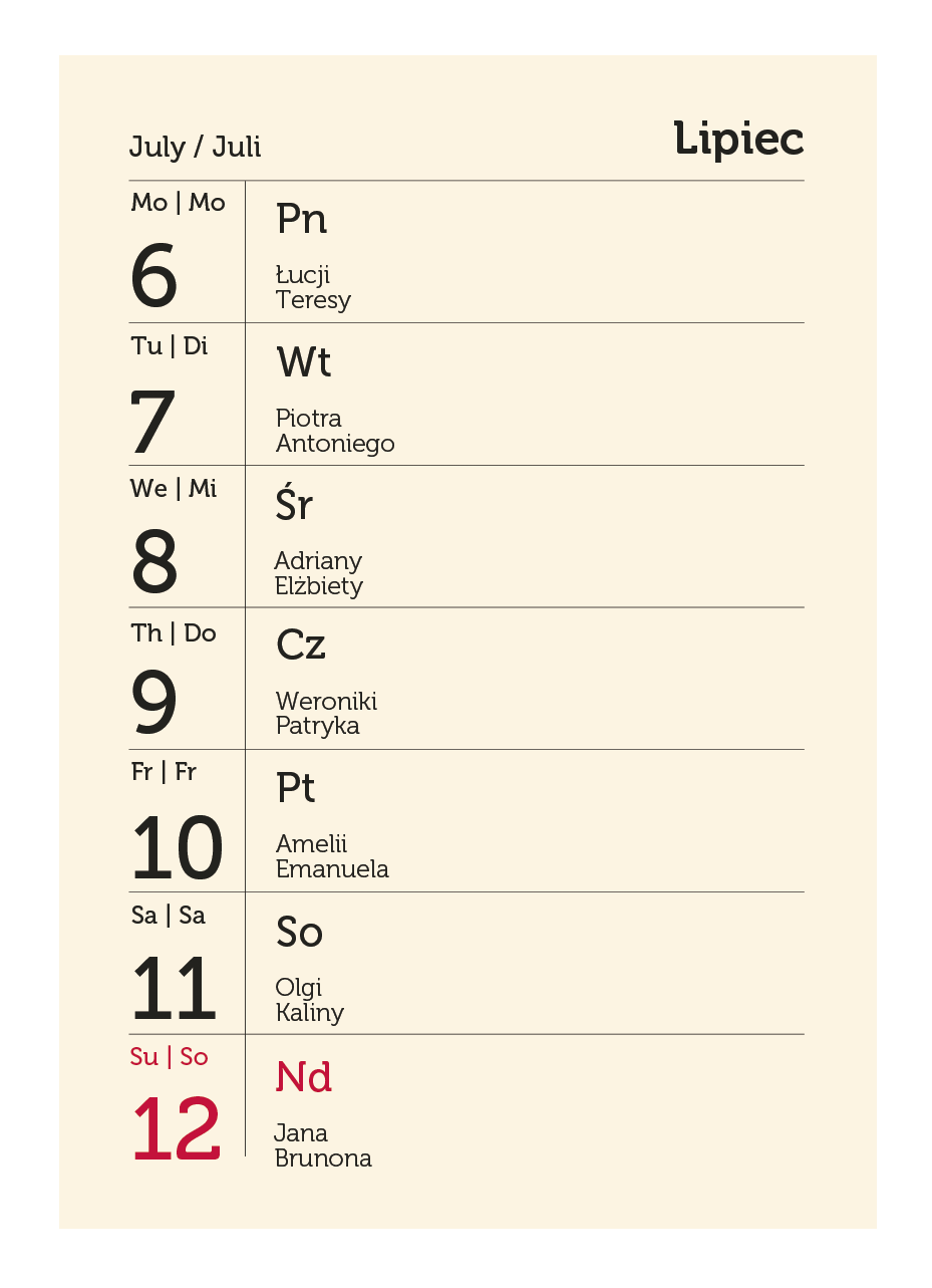 | układ kalendarium: | 1 tydzień - 1 strona |